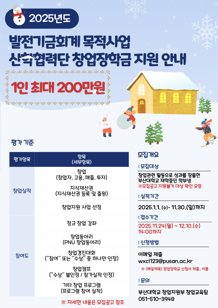 학내 학생들의 창업에 대한 관심 제고와 창업활동 장려를 위하여「산학협력단 창업장학금」을 지원한다고 하니 참고해 주시기 바랍니다.