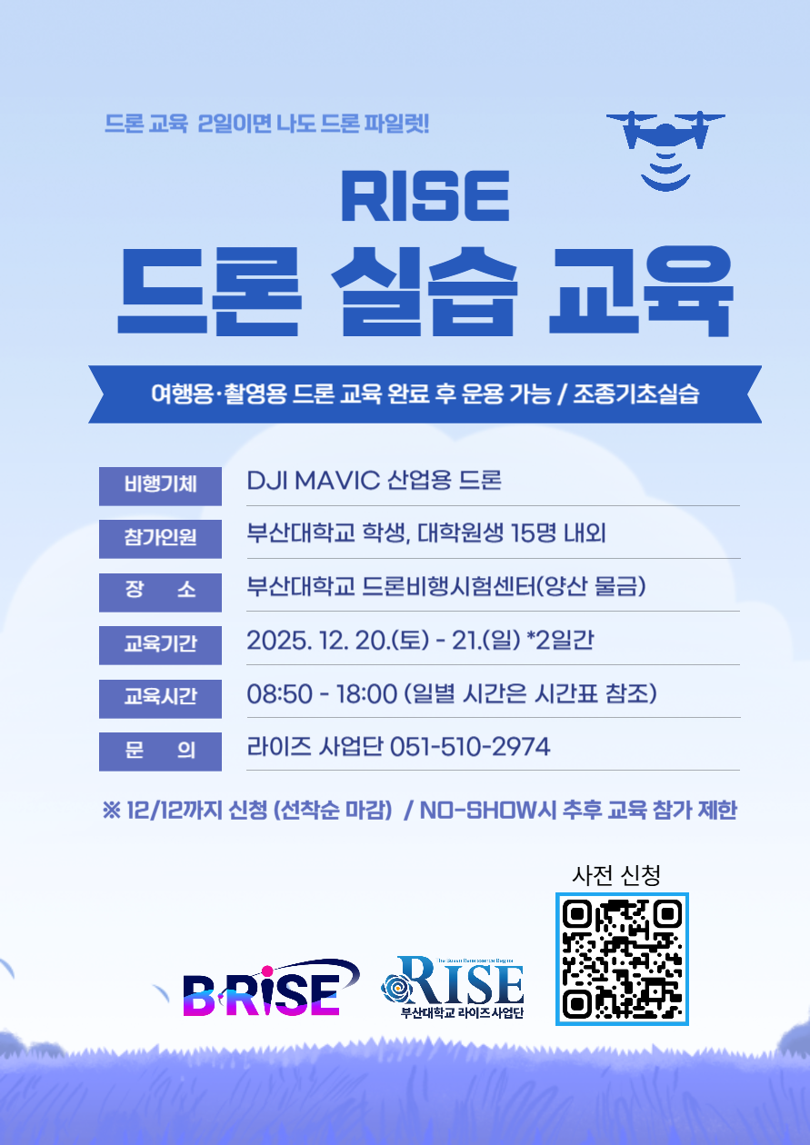 부산대학교 RISE 사업단에서는 드론 운용 및 활용 실전 교육을 아래와 같이 운영합니다.