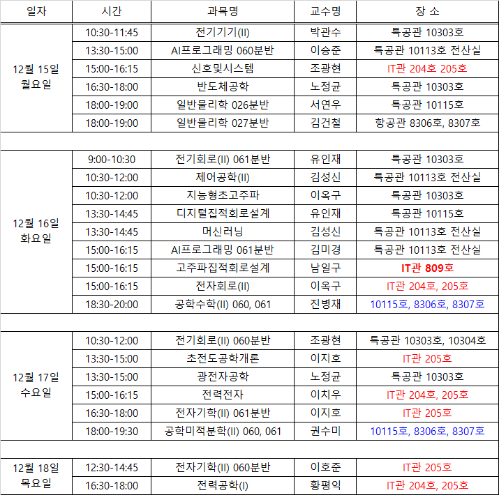 아래에 목록에 없는 과목들은 교수님께서 별도로 기말고사 일정을 공지한 과목들도 있으니 본인이 확인 해야 합니다.
