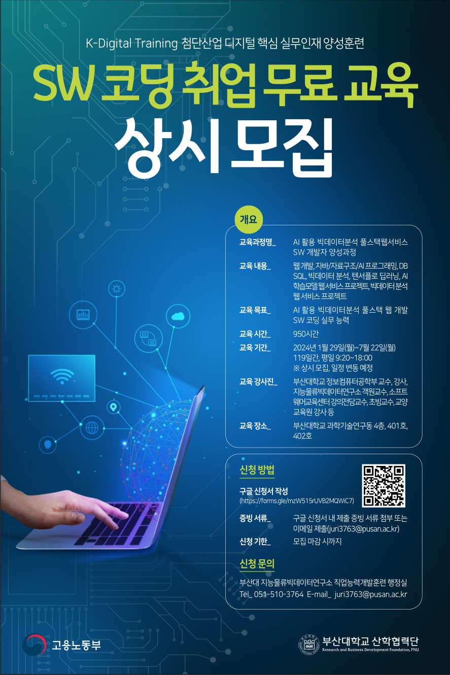 fnctId=bbs,fnctNo=2655 작성일 2023.12.20 수정일 2023.12.20 작성자 안수연 조회수 303 [부산대 K-Digital Training] AI 활용 빅데이터분석 풀스택웹서비스 SW 개발자 양성과정 공지문링크 : https://zrr.kr/7QFd 첨부파일 첨부파일이(가) 없습니다.